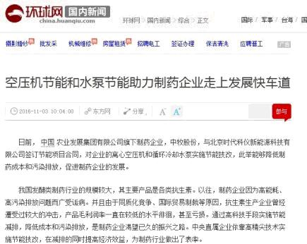 大家看一下,這是環(huán)球網(wǎng)的國內(nèi)新聞,是《空壓機(jī)節(jié)能和水泵節(jié)能助力制藥企業(yè)走上發(fā)展快車道》,我們瞄準(zhǔn)制藥的痛點(diǎn),就是它的空壓使用量特別大,而且離心空壓機(jī),它的節(jié)能特別困難,我們給他做之前,他的兄弟單位做了兩年的試驗(yàn),然后獲得成功,現(xiàn)在這個(gè)央企里面給他做節(jié)電,另外一個(gè)水泵系統(tǒng),水泵系統(tǒng)給他做最大能效(EER值),這樣一套系統(tǒng)。